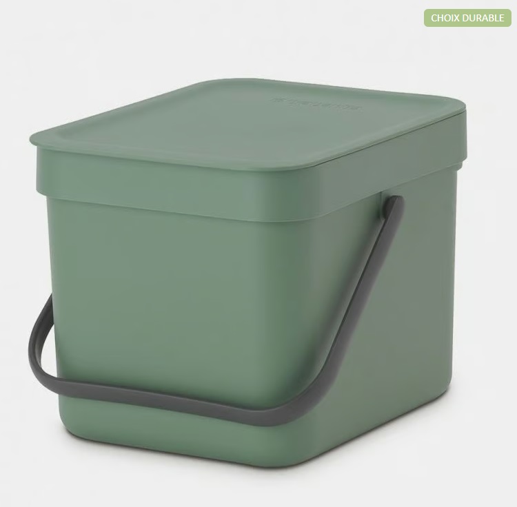Cette belle poubelle de 6 litres avec son couvercle pouvant rester en position ouverte est parfaite pour jeter les déchets organiques et autres restes… Déposez-la sur le plan de travail, dans un tiroir ou fixez-la au mur. Vous souhaitez un sac poubelle avec ? Nos sacs poubelle PerfectFit 100% compostables (code S) conviennent parfaitement – ils sont également faciles à placer !